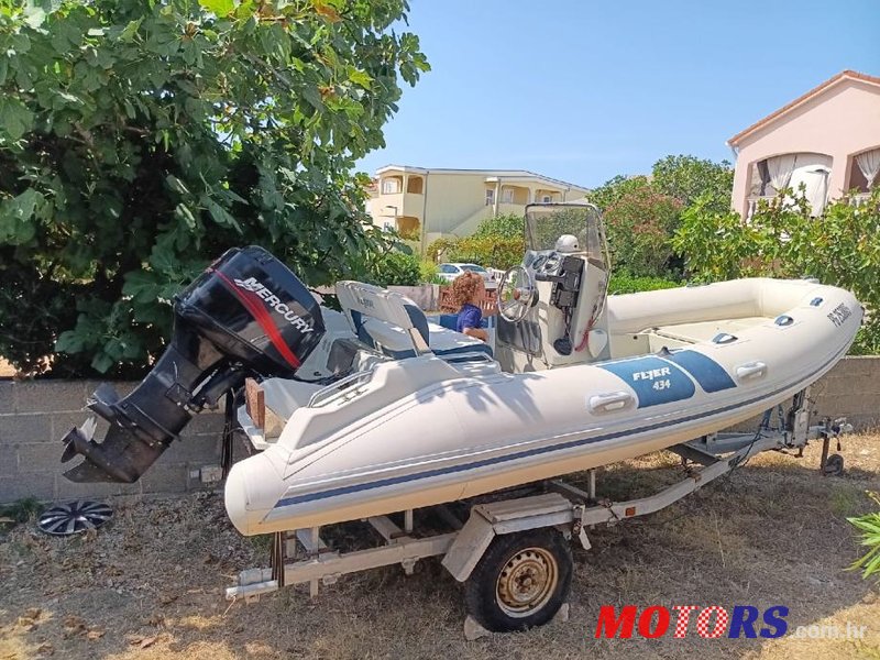 Gumenjak Flyer 434, dužine 4,6 m širine 2,2 m sa svom opremom. Motor Mercury 36,50 kw, ukupno 240 sati rada, s prikolicom. Redovno servisiran. Sve u odličnom stanju.