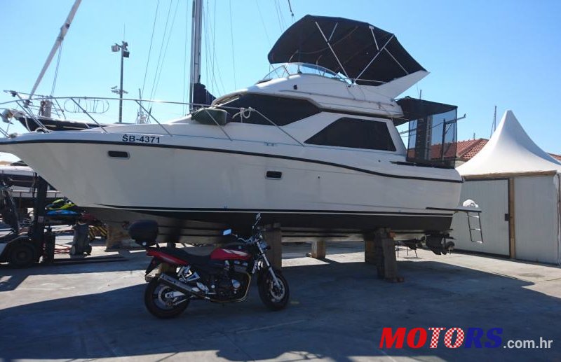 Brod potpuno opremljen za obiteljski godišnji odmor. Dvije kabine sa bračnim ležajevima, kupaonica sa wc-om i zatvorenom tuš kabinom, unutarnji kokpit, salon sa kuhinjom (frižider, sudoper, plinski štednjak...), fly bridge sa tendama. Krmena tenda, svi prozori imaju unutarnja sjenila i vanjske mreže/sjenila, topla voda, krmeni tuš i tuš u kupaonici, razvedene antenske tv i 12V instalacije, ventilatori (nema klime), prije nekoliko godina cijela unutrašnjost je pretapecirana, solarni punjač baterija, tri motorne baterije po 90 Ah + tri servisne baterije po 180 Ah, dva inox tanka za gorivo, tank vode 250 l, crni tank sa maceratorom 250 l, 2 x mercriuser 5.7 L od 184 kW, niti 50 radnih sati nakon remonta, sigurnosno gašenje požara u motornom prostoru, cijela krma je obučena u pluto (corkline), aluminijska pasarela, inox nosači pomočnog čamca (gruje), inox skale za u more, inox ograda na cjelom brodu, muzika alpine (sa daljinskim) sa zvučnicima u salonu i na fly bridgeu, led rasvijeta u tendi na fly bridgeu, fish finder, gps, pomočni čamac maestral. Sve je redovno održavano i u funkciji..brod je vlasnički i nikada nije bio u najmu. Brod se nalazi na šibenskom području. Zadnjih par godina brod stoji, te je potrebno napraviti servise motora, koper premaz, zamjenu cinkova i poliranje. Vez nije na prodaju! Cijena nije fiksna. Moguća zamjena za manji brod tipa Merry fisher uz nadoplatu.